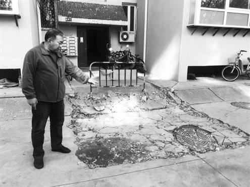 9月23日,是老樓加裝電梯的第一天,施工隊已經(jīng)入駐了進(jìn)來。他們在單元門前砸出了一個四四方方的坑,水泥地立刻“四分五裂”,正要繼續(xù)時,一樓業(yè)主突然跑來,站在塌陷中央,阻止施工隊繼續(xù)施工?!八f,她不同意在這里安裝電梯,為此,施工隊只好停下,勸業(yè)主們先自行協(xié)調(diào)?!?/p>