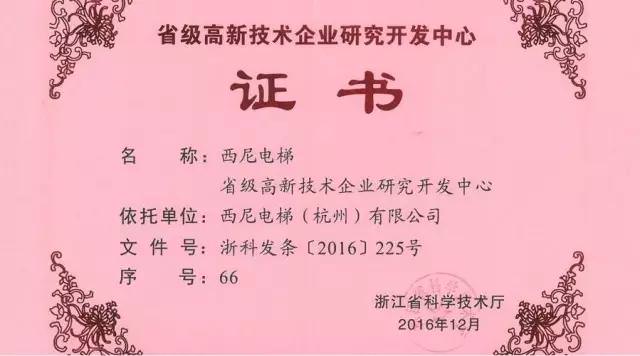 西尼電梯獲取“浙江省省級高新技術(shù)企業(yè)研究開發(fā)中心”榮譽(yù)證書