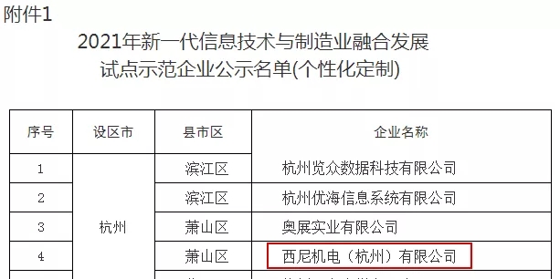 近日,浙江省經(jīng)濟和信息化廳官網(wǎng)發(fā)布公示了“2021年省級新一代信息技術(shù)與制造業(yè)融合發(fā)展試點示范企業(yè)名單”,西尼機電基于“電梯產(chǎn)品快速定制設(shè)計制造能力”入圍,是兩化融合管理體系貫標方向——個性化定制細分中,杭州地區(qū)僅入選的八家企業(yè)之一。
