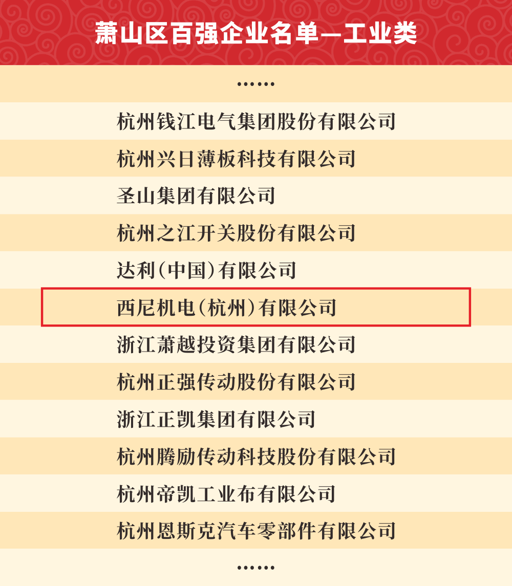 西尼機(jī)電多次入選“蕭山區(qū)百強(qiáng)企業(yè)”榜單。這一榜單是對我司綜合實(shí)力的展現(xiàn),也是對西尼發(fā)展的充分肯定和鼓勵(lì)。在未來,西尼仍將堅(jiān)持走高科技、高技術(shù)、創(chuàng)新化、高品質(zhì)的國際化發(fā)展道路,不忘初心,砥礪前行,實(shí)現(xiàn)更高的經(jīng)濟(jì)價(jià)值和社會(huì)價(jià)值。