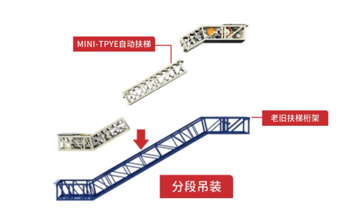 產(chǎn)品采用極窄桁架寬度設(shè)計(jì),分段出廠,現(xiàn)場對接組裝,完美解決舊梯無法整體拆除和新扶梯進(jìn)場難的問題。在施工過程中,不會影響商場、樓宇正常營業(yè),縮短工程周期。